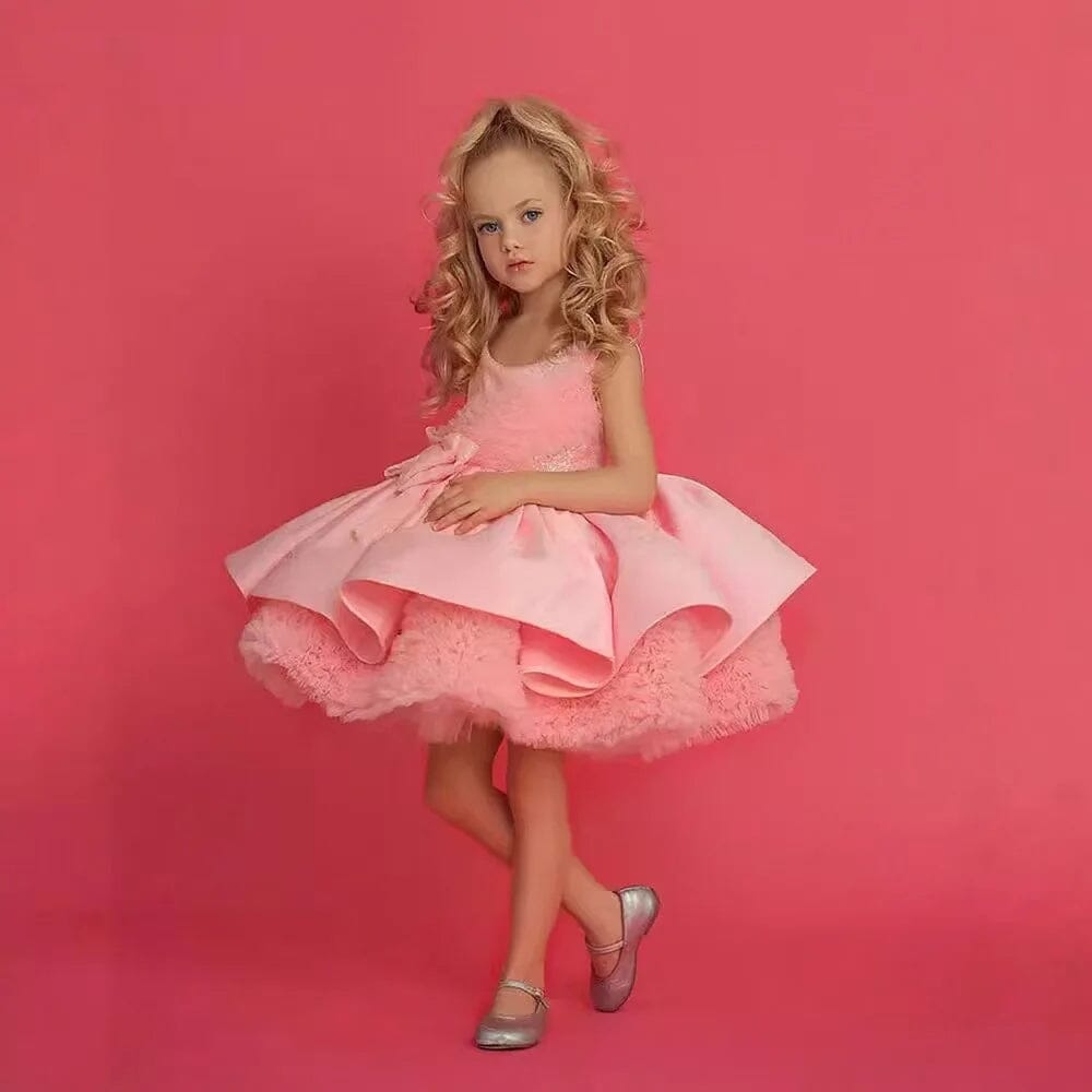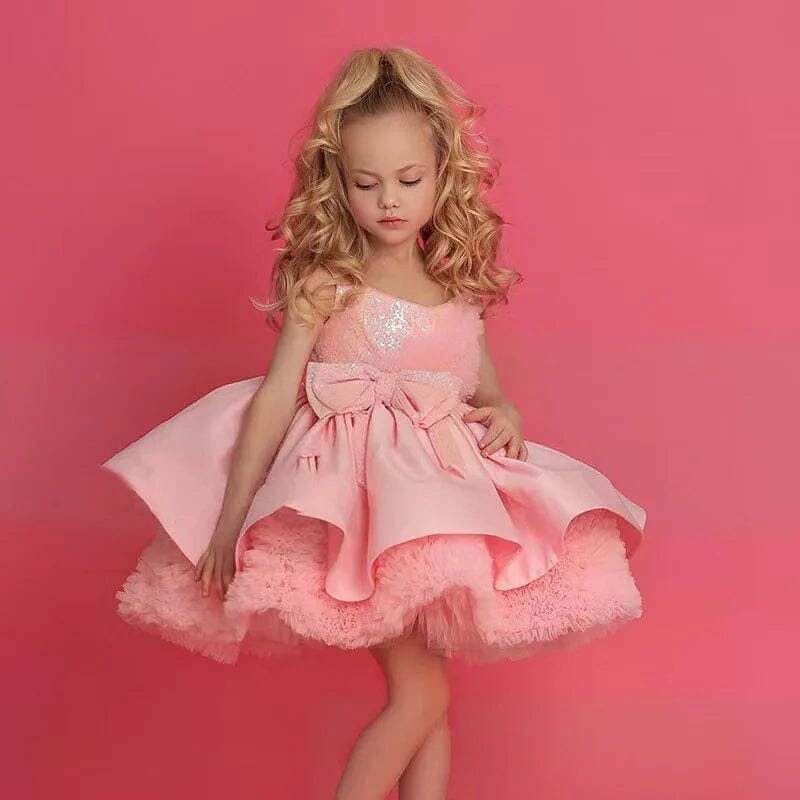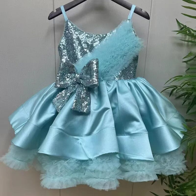 The bodice is beautifully embellished with sparkling sequins, creating a dazzling effect from every angle. A statement oversized sequin bow accentuates the waist, adding charming elegance and a touch of playful glamour. The voluminous ball gown skirt features cascading satin layers over fluffy tulle, giving the dress a full, dramatic silhouette ideal for twirling and photos.