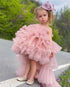 This dress is absolutely beautiful. The fabric is wonderful. This dress goes above the knee on the front of the dress and ankle length train on the behind. It's perfect for the holidays and would be a beautiful flower girl dress. It's perfect. Puffy multi-layers Tulle, Soft lining, protect baby girls tender skin. Girls formal party princess dress, detachable trailing gown design, skirt extends behind the dress.